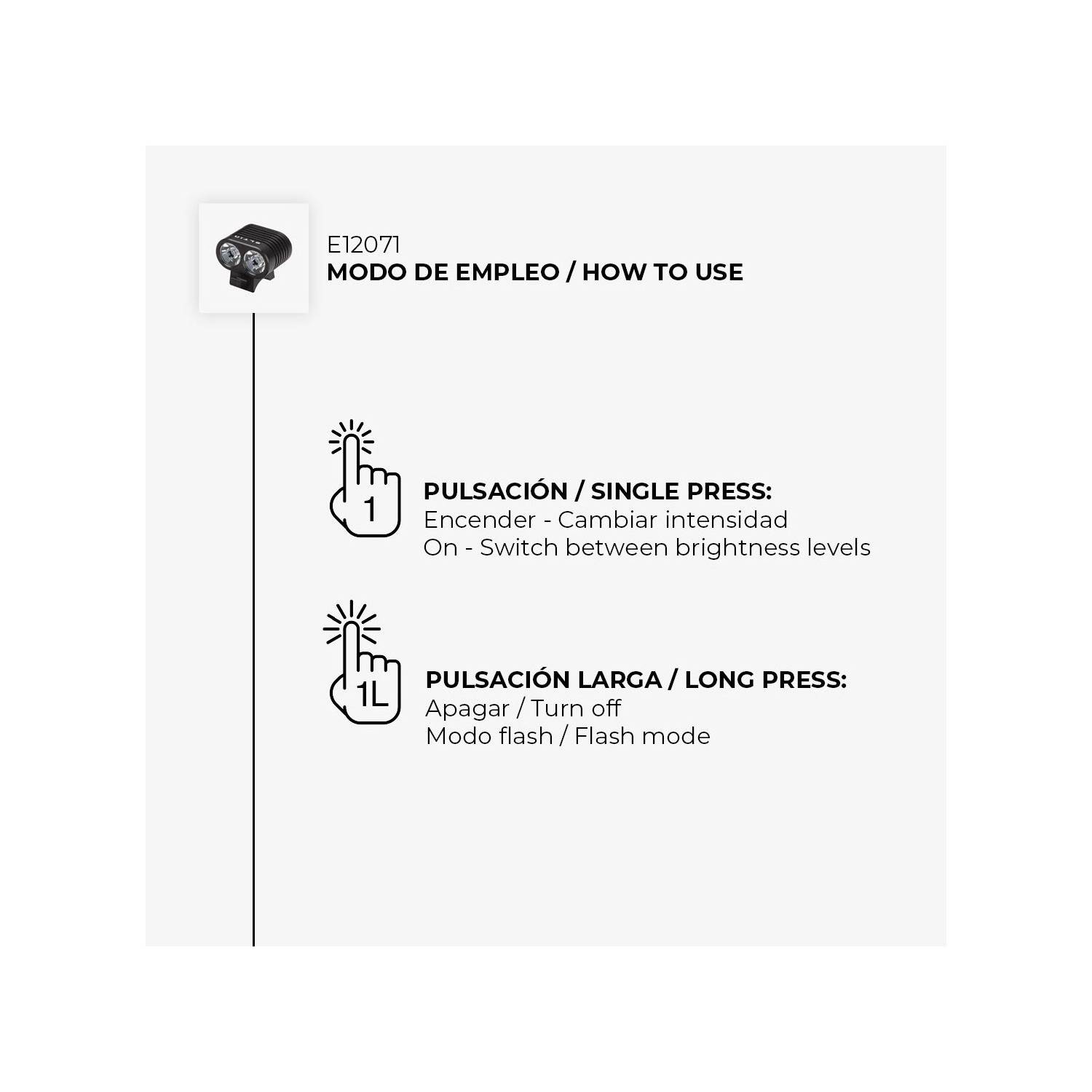 - El faro polivalente E12071, formado por un doble led CREE de hasta 1600 lúmenes, lo podrás utilizar en largas salidas gracias a su gran batería externa de 4400mAh ya que proporciona hasta 30 horas de autonomía en su modo de uso más conservador (3h al 100%).
