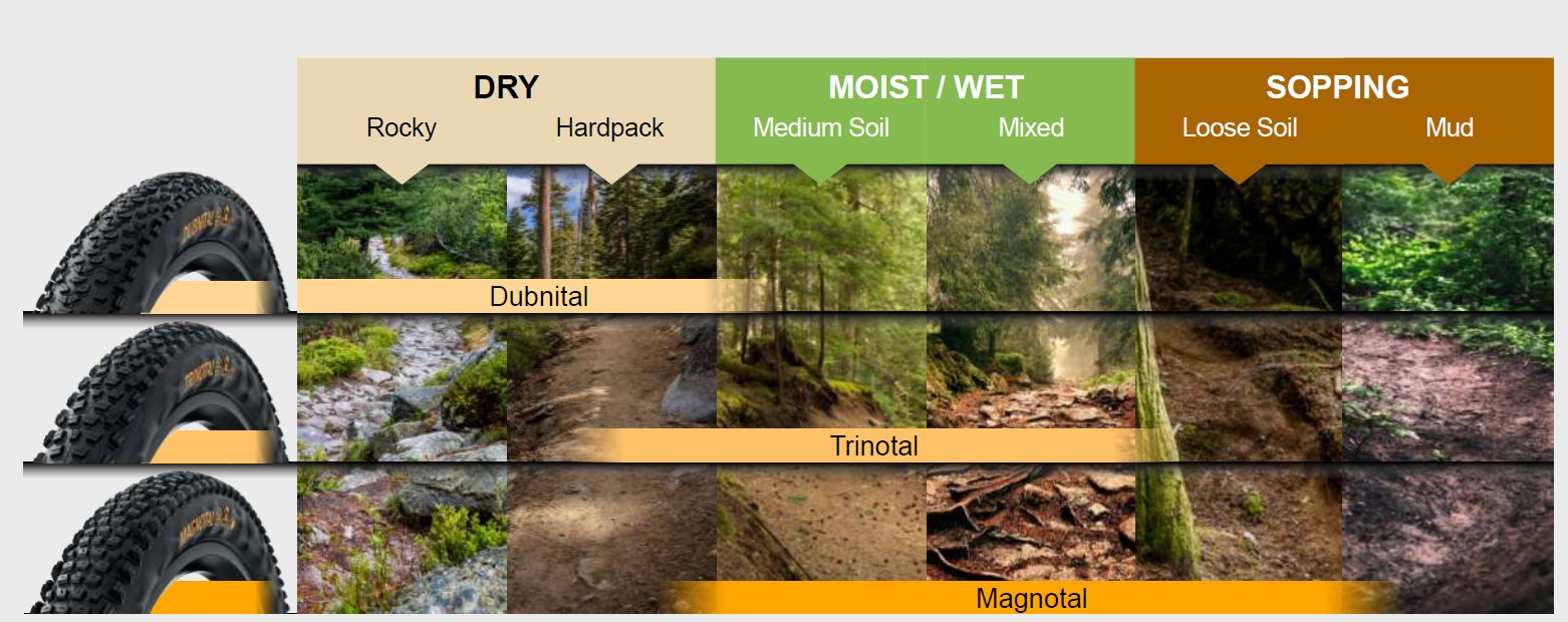 - El Continental Trinotal ha sido desarrollado para mejorar el comportamiento en curvas y frenada a la vez que garantiza un agarre de primera clase en condiciones difíciles.